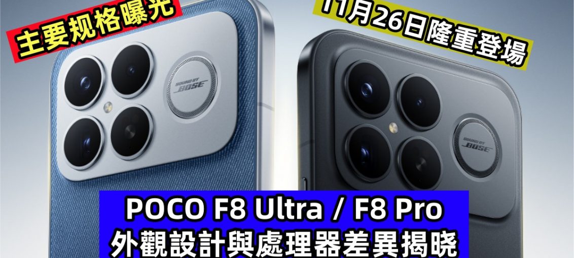 11月26日隆重登場:POCO F8 Ultra / F8 Pro 外觀設計與處理器差異揭晓;主要规格曝光! Android 最新消息 by Victor Ng - 18 11 月, 20250 距離 11 月 26 日的全球發布會越來越近,POCO 似乎已按捺不住,率先在社群平台公開了 F8 Ultra 與 F8 Pro 的核心處理器資訊。這一波主動曝光,不但讓 F 系列今年的產品定位更明確,也替即將登場的雙旗艦鋪下更高的期待值。 (adsbygoogle = window.adsbygoogle || []).push({}); 56026