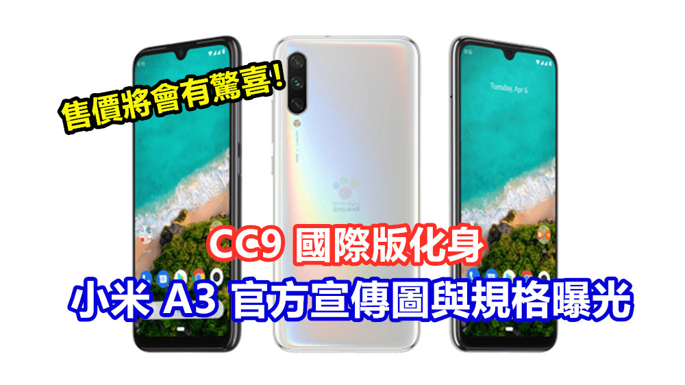 讓我們來迅速了解小米 A3 的規格,這部新機主打的可是接近原生的 Android One 系統。除了保障了兩年系統更新外,小米A3 也配置了6.088 寸AMOLED 屏幕,屏幕分辨率僅有HD (720 x 1560) 水平,水滴部位裝下了一顆3200萬像素自拍鏡頭;另外小米也為這部新機配置了時下流行的屏幕指紋解鎖功能,也算是彌補了分辨率不高的遺憾吧!