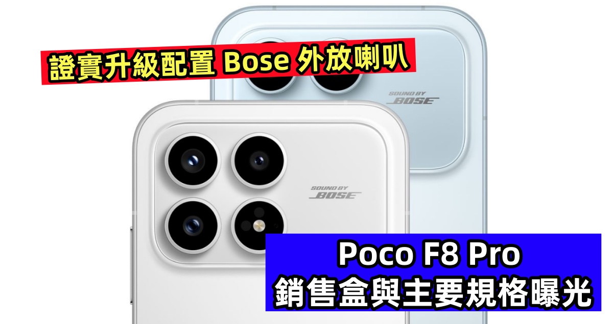 近日網上流出一張疑似 Poco F8 Pro 銷售盒照片,而最吸睛的地方莫過於上面印著的 「Bose Sound」音效標誌。值得注意的是,這正是上個月於中國登場的 Redmi K90 Pro Max 與 Redmi K90 所主打的音效系統,也意味著 F8 Pro 很可能就是 Redmi K90 的全球版,而 F8 Ultra 則對應 K90 Pro Max。畢竟這並非 Poco 第一次以相同機型策略重新命名推出。