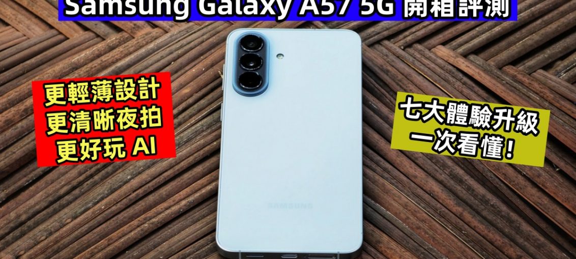 Samsung Galaxy A57 5G 開箱評測:更輕薄設計、更清晰夜拍、更好玩 AI;七大體驗升級一次看懂! Android Review 最新消息 by Victor Ng - 12 4 月, 202612 4 月, 20260 一向來 Galaxy A 系列是三星智能手機銷量的支柱,續去年陸續融入更多 AI 功能后,今年全新一代 Samsung Galaxy A57 5G 繼續注入更多旗艦級元素,當中外形與質感不單更靠攏旗艦機,同時三星也為它注入更輕薄設計以及更强夜拍能力,同時還首次加大容量,讓這代中端的競爭力頓時大增。 那到底今年 Galaxy A57 5G 對比前代在哪方面做出升級了? 大家趕快來透過這開箱初體驗文章了解更多。 Samsung Galaxy A57 5G Android 16 + OneUI 8.5 IP68 防水防塵設計 6.7 寸 FHD+ (1080 x 2340 )分辨率 SuperAMOLED 屏幕、120Hz 高刷、1200nits 最高亮度 體積:161.5 x 76.8 x 6.9 mm 體重:179g Exynos 1680 八核處理器 12GB RAM 256GB / 512GB 内置容量 【5000萬(主;F1.8;OIS) + 1200萬(超廣角;F2.2) + 500萬(微距;F2.4) 】三攝鏡頭 1200 萬像素自拍鏡頭 + F2.2 光圈 雙立體聲外放喇叭 屏下指紋解鎖 藍牙6.1、WiFi 6E 5000 mAh 電量 + 45W 閃充 外觀設計與造工 屏幕表現 相機表現 處理器性能 電航力 系統表現與升級 4.1 Summary 續去年推出表現穩定且深受市場歡迎的 Galaxy A56 後,今年三星順勢推出的 Galaxy A57 5G 在整體體驗上再往前推進。這部主攻中端市場的新機,今年在設計上的一大優化就是變得更輕薄,其機身厚度削薄至 6.9mm、重量降至 179g,再加上升級至 IP68 防水與更窄邊框設計,日常攜帶與長時間使用的舒適度明顯提升;配合更省電的 Super AMOLED+ 螢幕與語音轉錄(Voice Transcription)等 AI 功能的加入,整體使用體驗更貼近當下用戶需求。 儘管紙面規格升級幅度不算誇張,但三星在影像與系統優化方面依然下了功夫。得益於更強的 ISP 與夜景演算法,Galaxy A57 5G 在低光環境下的拍攝表現更可靠,成像亮度、細節與穩定性都有實際提升;同時 Exynos 1680 處理器搭配 One UI 8.5 的調校,也讓整體流暢度進一步優化,再加上續航表現對比前代有所提升,以及首次加入 512GB 容量版本,日常使用的完整性確實更高。 憑著更輕薄設計所帶來的高便利性、夜拍體驗的實際提升,以及更完善的 AI 功能,Galaxy A57 5G 依然是一部表現均衡且定位清晰的中端機。不過需要注意的是,其上市定價與目前已降價至相對親民區間的 Galaxy S25 FE 差距不大,若您對性能或變焦拍攝有更高要求的話,那麼直上定位更高的 S 系列機型,或許會帶來更全面的體驗。 Samsung Galaxy A57 5G 開箱圖 Galaxy A57 5G 的銷售包装盒整体设计与前代一样充滿活力,正面直接印上了新機的色彩款式圖片,加上大大的 Galaxy A57 5G 字眼,整體相當醒目吸睛。 延續環保策略,今年 Galaxy A57 5G 依舊沒隨機附送充電器;零售盒內附:- Galaxy A57 5G 手機 x1 Type C USB 數據線 x1 Sim卡針 x1 說明書 x1 初體驗報告 1. 6.9mm 超輕薄機身 + 旗艦級材質、更窄黑邊框設計! 這次進入 VTECH 拿到的 Samsung Galaxy A57 5G 評測機色彩款式是相當有活力的冰藍(Icyblue)款式,其粉粉的淺藍色散發出一絲夏天的活力以及年輕的文青氣息,非常好看。 首次上手,可明顯感受到 Galaxy A57 5G 變得更輕更薄了,同時金屬中框與 Gorilla Glass Victus+ 前後玻璃繼續提供媲美旗艦的質感,持握感相當棒。 向 Galaxy S 系列看齊,今年 Galaxy A57 5G 瘦身成功,其 6.9mm 機身厚度以及 179g 重量對比前代分別削薄了 0.5mm 以及輕了 19g,這讓其携帶性與持握舒適感有感升級,值得一贊! 除了更輕薄外,Galaxy A57 5G 也進一步縮窄了熒幕黑邊框厚度,對比前代其屏佔比更高了,顔值也更佳! 翻看背面,Galaxy A57 5G 采用了與 Galaxy S26 系列相似的橢圓形相機模組設計, 為這款中段機注入了旗艦特性。 值得一提的是,Galaxy A57 5G 的相機模組加入了與機身同色的外圈設計,這讓整體外觀更具層次感,同時也增添了更多年輕好玩氣息。 2. 升級配置 IP68 防塵防水機身設計 另一項不得不提的是,今年 Galaxy A57 5G 的防水防塵設計從前代的 IP67 升級至與 Galaxy S26 系列看齊的 IP68。 這意味著您的手機可抵抗在1.5米深的水中浸濕30分鐘;日常生活中就算碰到極端天氣如狂風暴雨也不必擔心手機會受潮而損壞;若手机若脏了要用清水清理也没问题。 3. 主攝獲更强更快 Nightography 夜拍能力! 拍攝方面,Samsung Galaxy A57 5G 配置了【5000萬(主; F1.8; OIS) + 1200萬(超廣角;F2.2) + 500萬(超微距)】像素三攝鏡頭規格;主攝支援 OIS 光學防震系統;同時 1,200萬像素超廣角鏡頭可實現123度超廣視野拍攝;而另外一則 500萬像素鏡頭則可玩超微距拍攝。 根據官方説法,今年的主攝鏡頭支援更强的 Nightography 演算法以及 SuperHDR 技術,這讓夜間拍攝的影像更明亮清晰,無論在白天或夜晚您都能隨手獲得同等高畫質。 此外,得益於更强 ISP,Galaxy A57 5G 的成像處理獲得 4x 提升,這讓拍攝體驗明顯更迅速,同時各鏡頭切換也明顯更順滑。 正所謂沒圖沒真相,接下來就帶大家迅速看看 Galaxy A57 5G 的日拍與夜拍效果 ~ ▲ 主攝鏡頭拍攝(日拍 vs 夜拍) ▲ 主攝鏡頭拍攝(日拍 vs 夜拍) ▲ 主攝鏡頭拍攝(日拍 vs 夜拍) ▲ 主攝鏡頭拍攝(日拍 vs 夜拍) 得益於更强 ISP 以及 演算法加持,我們看到 Galaxy A57 5G 在一般夜景環境下確實能拍攝出非常清晰圖片,整體畫質與日光拍攝相比并沒太大差異。 ▲ 主攝鏡頭拍攝(夜景模式) 值得一贊的是,這次 Victor 發現 Nightography 演算法確實有感提升,Galaxy A57 5G 的夜拍在噪點控制方面更出色,同時高光與暗光處理也更成熟,高光