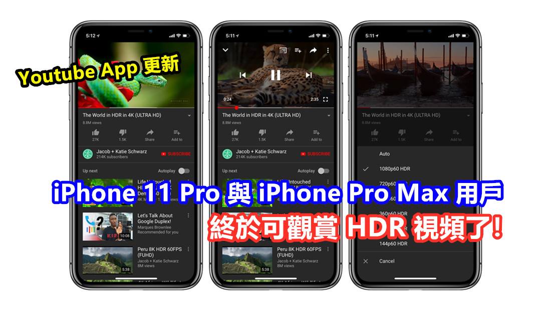 各大主流 Apps 對於蘋果產品的軟件支持一直都相當給力,當然 Youtube App 也不例外。自 iPhone 11 系列全球轟動上市一個月後,今天我們看到 Youtube 在最新軟件更新中加入了一項重要功能,iPhone 11 Pro 與 iPhone Pro Max 用戶終於可觀賞 HDR 視頻了!
