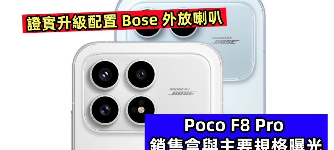 證實升級配置 Bose 外放喇叭:Poco F8 Pro 銷售盒與主要規格曝光;不再隨機附送充電器! Android 最新消息 by Victor Ng - 8 11 月, 20250 原本大家預期 Poco F7 Pro 與 F7 Ultra 的後繼機要等到明年三月左右才會亮相,但如今看來,它們的登場時間或許比想像中更快。根據最新消息,Poco F8 Pro 與 F8 Ultra 已通過多國認證機構審核,意味著正式發佈時間很可能提前。 (adsbygoogle = window.adsbygoogle || []).push({}); 55880