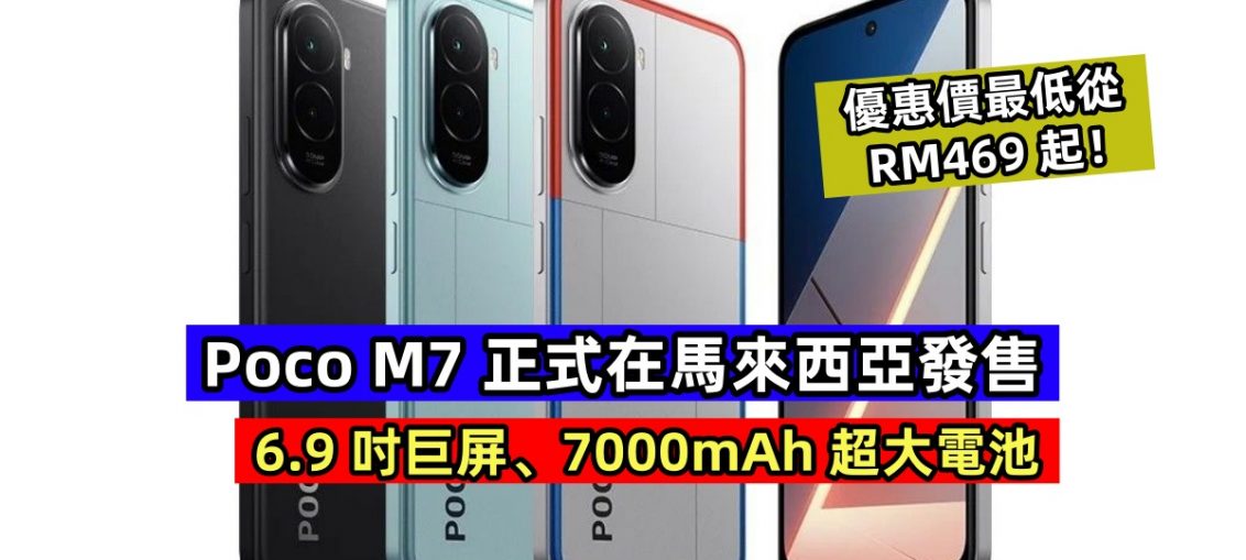 6.9 吋巨屏、7000mAh 超大電池:Poco M7 正式在馬來西亞發售;優惠價最低從 RM469 起! Android 最新消息 by Victor Ng - 17 8 月, 202517 8 月, 20250 在印度市場推出 M7 Plus 后,另一部門檻更低的 POCO M7 終於在馬來西亞正式發佈,這款新機以「超大電池」為核心賣點,同時結合年輕化設計、沉浸式大螢幕與升級效能,為低階市場帶來全新選擇。 (adsbygoogle = window.adsbygoogle || []).push({}); 外觀方面,Poco M7 同樣采用了打孔屏搭配背面類似墻磚的綫條分割綫設計,同時配上了橢圓形相機模組設計。 M7 延續品牌一貫大膽的潮流設計語言,機身提供 銀、藍、黑 三種顏色,分別展現不同個性。銀色版本融入紅藍細節,帶有科幻與英雄元素;藍色則具備機甲風格;黑色則回歸極簡與低調。全系列均具備 IP64 防塵防濺水,日常使用更安心。 (adsbygoogle = window.adsbygoogle || []).push({}); 顯示屏方面,這部新機正面搭載 6.9 吋 Full HD+ LCD,支援 144Hz 更新率與 850 nits 峰值亮度,這可是 POCO M 系列歷來最大尺寸;螢幕同時通過德國萊因低藍光、無頻閃、護眼節律三重認證,長時間使用更護眼/ 由於未用上 AMOLED 熒幕,這部入門級手機僅配置旁側指紋解鎖鍵;同時打孔位置裝下單顆 800萬像素自拍鏡頭。